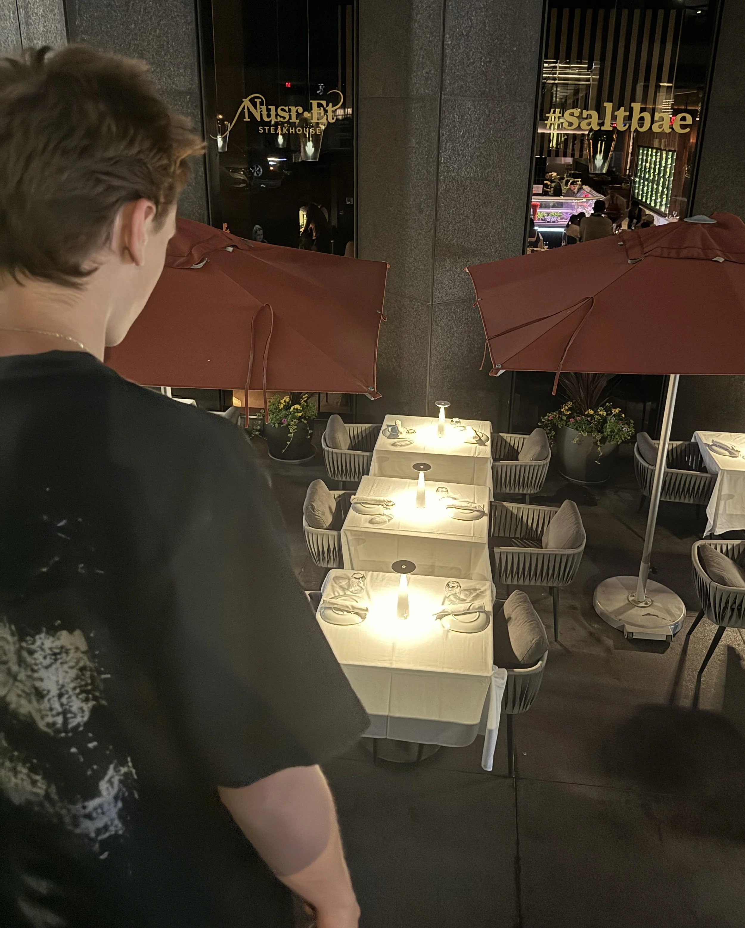 The sidewalk overlooks this restaurant on 53rd. The Bills fan in him really eyed that table. For those who don’t know - Bills fans break a lot of tables.